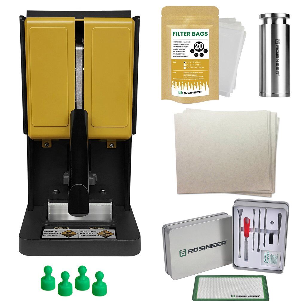 There are tons of rosin press manufacturer’s out there, but our favorite entry level press is the Rosineer PRESSO. It has the perfect balance between ease of use and features that most home pressers find to be ideal. The Rosineer PRESSO rosin extraction press makes it easy to press rosin in the comfort of your home. Just set up your temperature and time on the digital control panel, load your herbs, and press away!