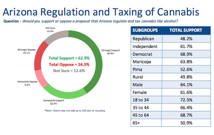 While 24.3 percent of those surveyed noted they opposed the outright legalization of recreational marijuana in the Grand Canyon state, support for regulating and taxing the plant was typically highest in specific subgroups; individuals between 18 and 34 years old (72.5 percent), Democrats (68.9 percent), and Independents (61.7 percent).