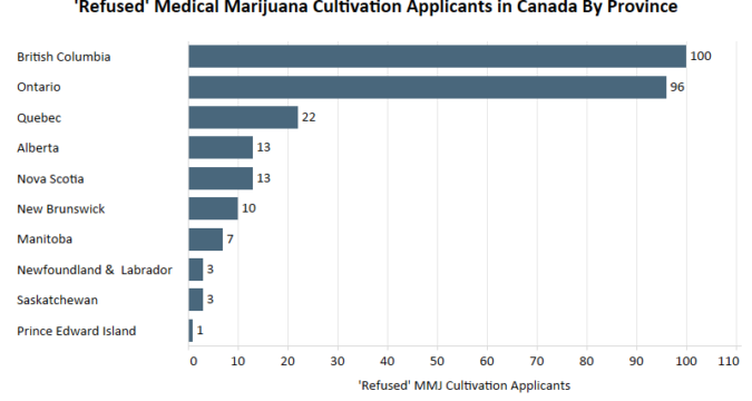More businesses have been denied medical cannabis cultivation licenses in British Columbia than in any other province in Canada, according to new data provided to Marijuana Business Daily by Health Canada.