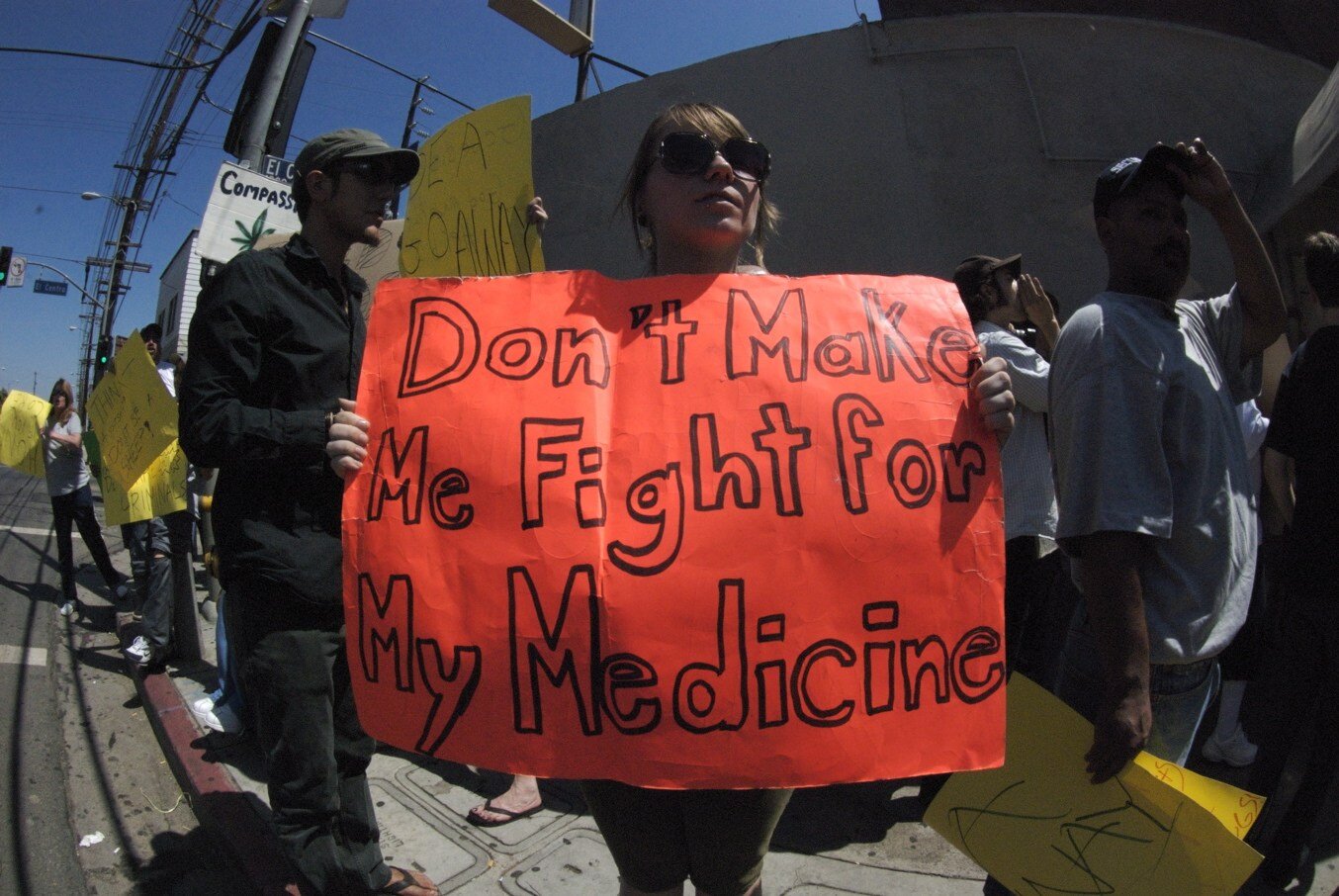 Medical marijuana patients protest during a DEA raid on a medical marijuana dispensary in Hollywood, California in 2007. (Wikimedia)