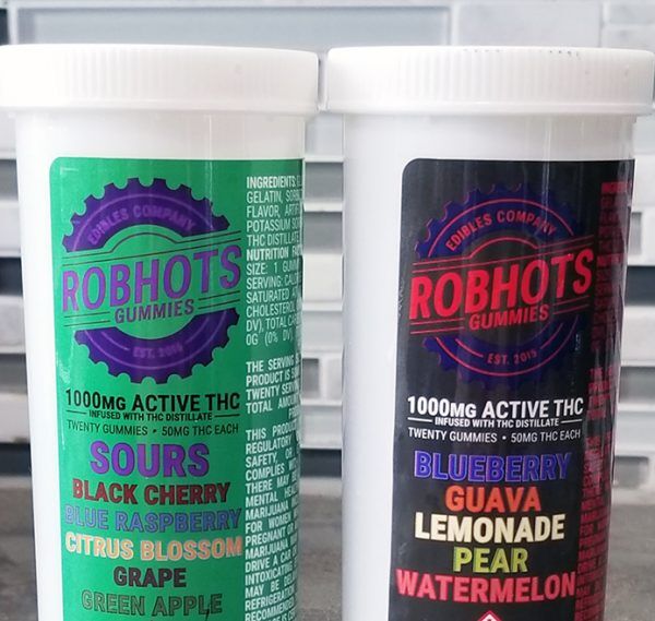 Previously, the 500mg Robhots gummies (10 x 50mg pieces) came in a dual flavored container (strawberry & banana) at a 50-50 ratio giving you had 5 – 50mg THC gummies of each flavor. The new Robhots 1000mg gummies contain 20 x 50mg pieces in 5 flavors; 4 gummies of each flavor.