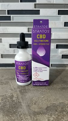 The Stratos CBD Tincture has a 15:1 ratio of CBD to THC derived from a Hybrid strain. The serving size listed on the bottle is 3ml. That means you need to take 3 full droppers. One serving contains 5mg of CBD and 0.33mg of THC.
