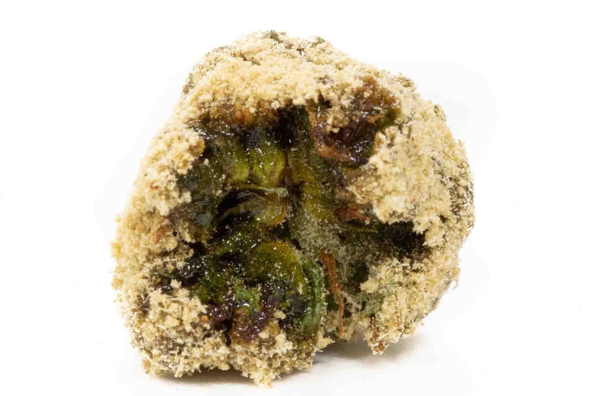 - Gently roll it forth and back in the kief until the bud is completely covered in kief.